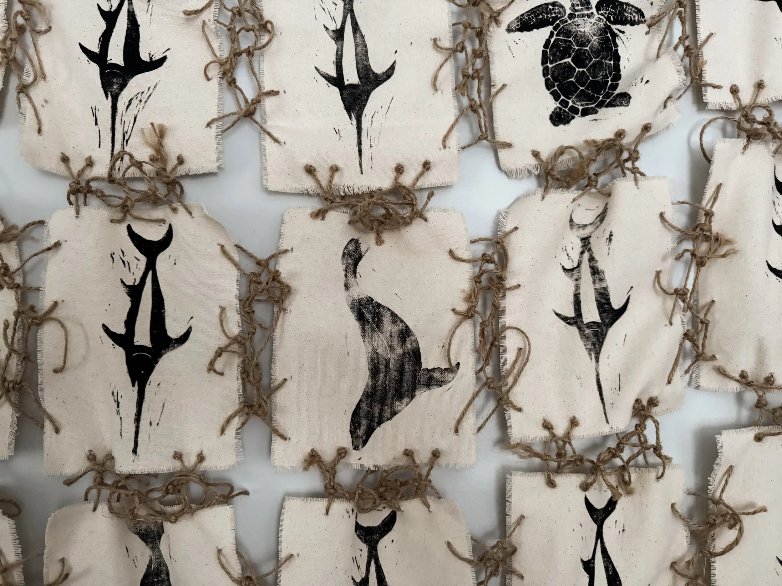 Constructed from 40 rectangles of cotton woven together with twine, 3:1 explores the ratio of harmful bycatch caused by large-scale driftnet fishing. Often called “curtains of death,” I wanted to reimagine the gillnet as a hybrid of something both indoors and outdoors. Key species were identified, carved in linoleum, and hand-printed on distressed fabric. The repetition of the pattern is meant to build upon the repetition of the catch and perpetuation of bycatch—something that could go on forever and become more tangled.